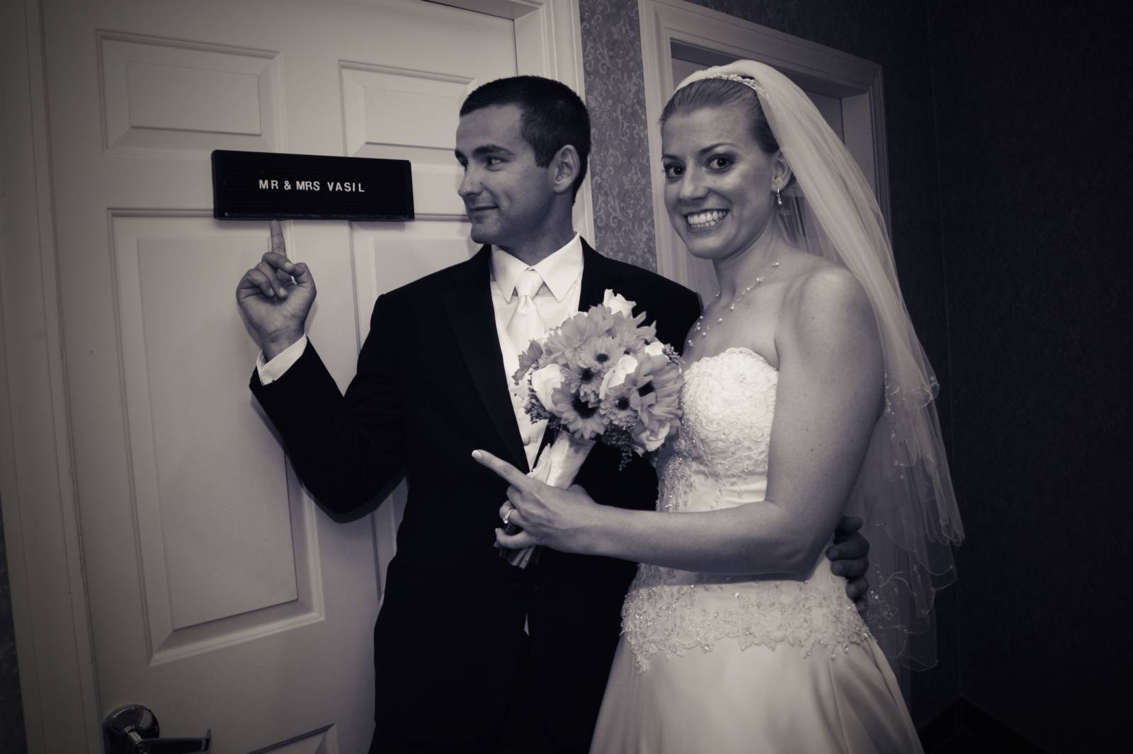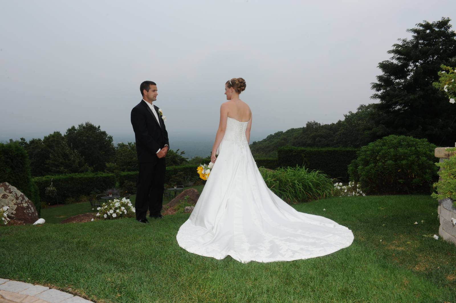 Sarah & Matt had their wedding ceremony and reception on August 31, 2013 at The Log Cabin in Holyoke Massachusetts. We started pre ceremony coverage inside the two VIP rooms. This coverage can involve photos while make up and hair dressing is being done. It often includes dramatic photos of the bride’s gown and accessories such as shoes and jewelry in a nice grouping. This may also include macro photos of the bride’s diamond ring nestled in her bouquet. These photographs are some of our favorites to enhance in post production back in the studio. The guys wanted to go outside for some fun shots prior to the ceremony. As you probably noticed there was a horse head mask worn by Matt as a private joke, it made for some interesting photographs throughout the evening. Sarah had a message for Matt on the bottom of her shoes; if you look carefully you can see the blue letters. The weather was warm and a bit humid with an overcast sky. The spirits of the guests and wedding party were as if the sun was shining upon them. The ceremony took place with the Rev. Richard Fournier as officiant. After the ceremony we did some awesome formal groups with the beautiful Log cabin vista showing the mountains in the distance. The vista is always a wonderful background for wedding photographs. After the formals the introductions began and our couple of honor proudly entered The Easthampton room. The couple went directly into their first dance, followed by toasts and dinner. The evening was filled with dancing and good conversation, the dance floor was busy all evening even when Sarah and Matt were visiting each table saying hello to their guests. DJ Chris Neil did a great job entertaining the guests. Please enjoy some of Sarah and Matt’s photographs from their wedding day.